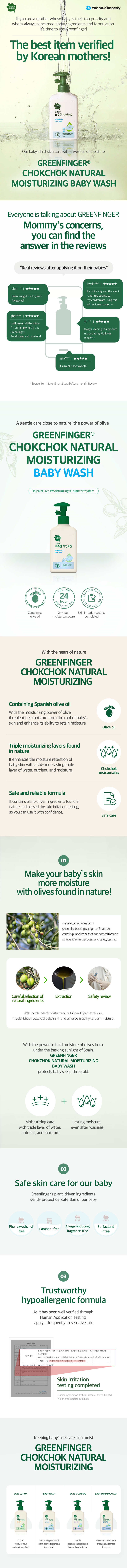Korean Greenfinger ® Chock Natural Moisturising Cloth Body Wash Provides Triple Protecting. Moisture, nourishment and moisture protection are the triple layers of preservation. Moistens Babiy's for extended time after wash.