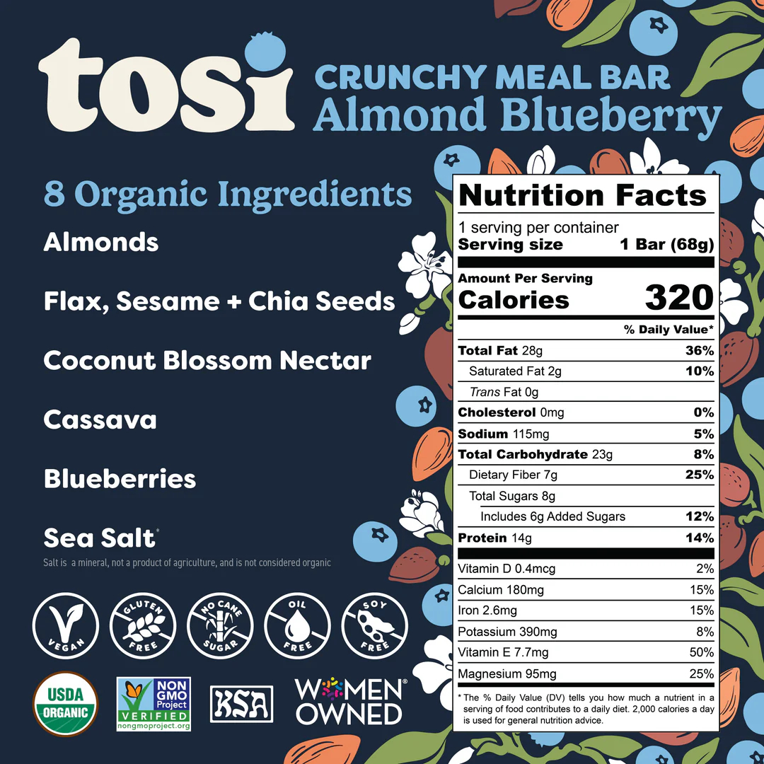 Tosi Bar (organic, vegan, sugar free, gluten free, oil free, Non-GMO). Great for health snacking, adult and kid's snacks, meal replacement, energies replacement after exercising