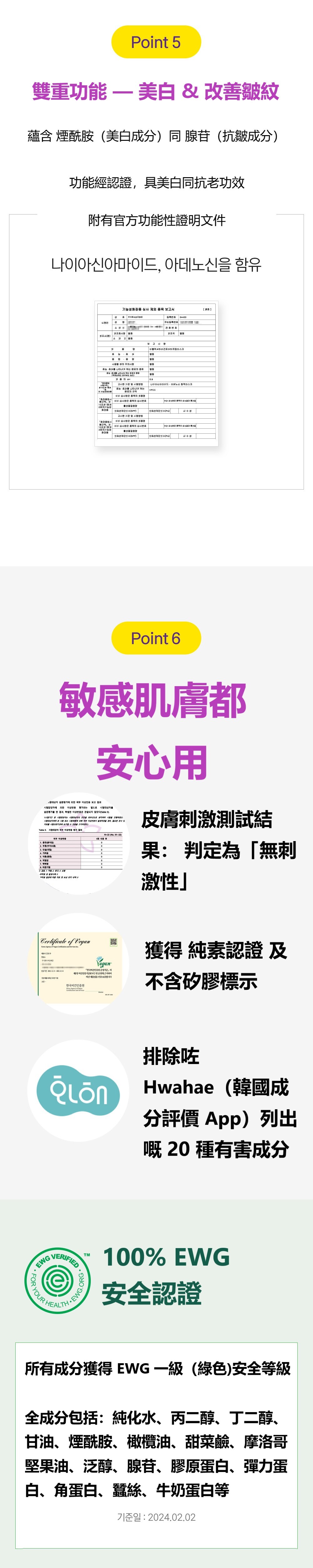 精製水、丙二醇、丁二醇、甘油、煙酰胺、尿囊素、甜菜鹼、羥基乙酰苯酮、泛醇、卡波姆、三乙醇胺、氨基丙烯酸二甲基牛磺酸銨/VP共聚物、乙基己基甘油、檸檬酸、腺苷、山茶花萃取物、EDTA二鈉、1,2-己二醇、透明質酸鈉、黃連萃取物、水解透明質酸、乙醯化透明質酸鈉