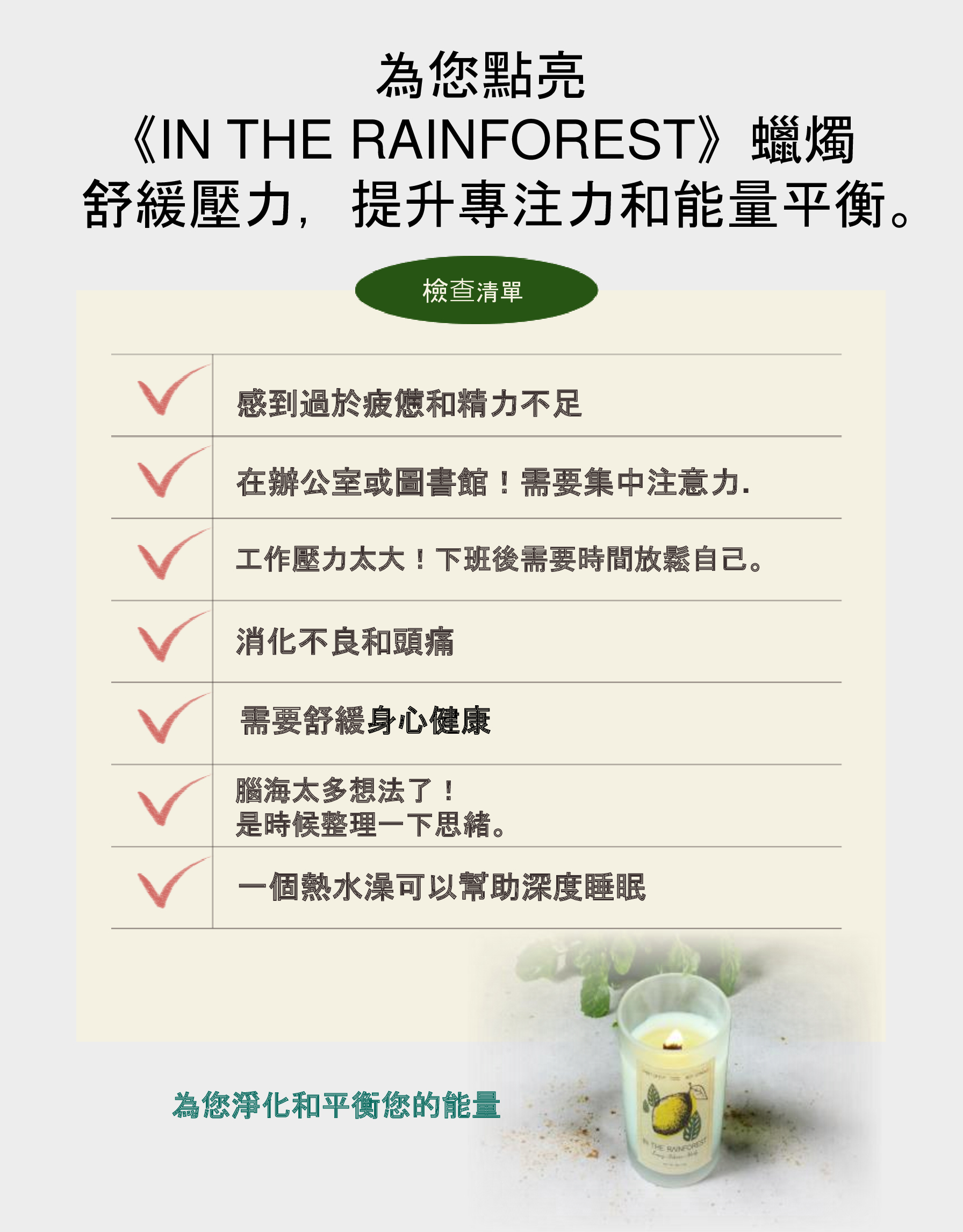 在雨林中 - 精油手工製作蠟燭就像在熱帶森林中一場寧靜的陣雨 - 混合了香醋和樹木的香氣在雨天的空氣中飄蕩,還有新鮮的青草如檸檬的香味。