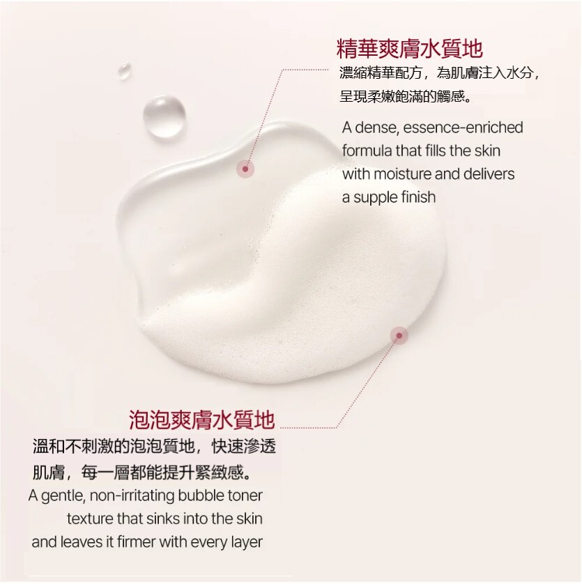 輕盈質感快速吸收,不黏膩,令肌膚即時清爽。每日使用,膚質更柔軟、更緊緻、更亮澤,為後續精華及面霜打好基礎。