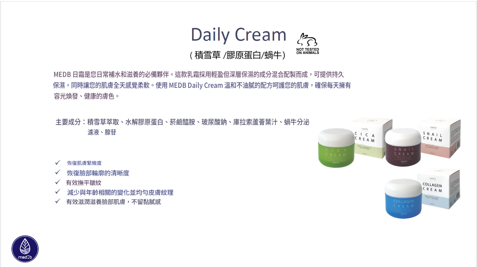 MEDB 日霜是您日常補水和滋養的必備夥伴。這款乳霜採用輕盈但深層保濕的成分混合配製而成,可提供持久保濕,同時讓您的肌膚全天感覺柔軟。使用 MEDB Daily Cream 溫和不油膩的配方呵護您的肌膚,確保每天擁有容光煥發、健康的膚色。