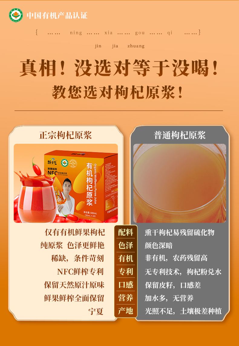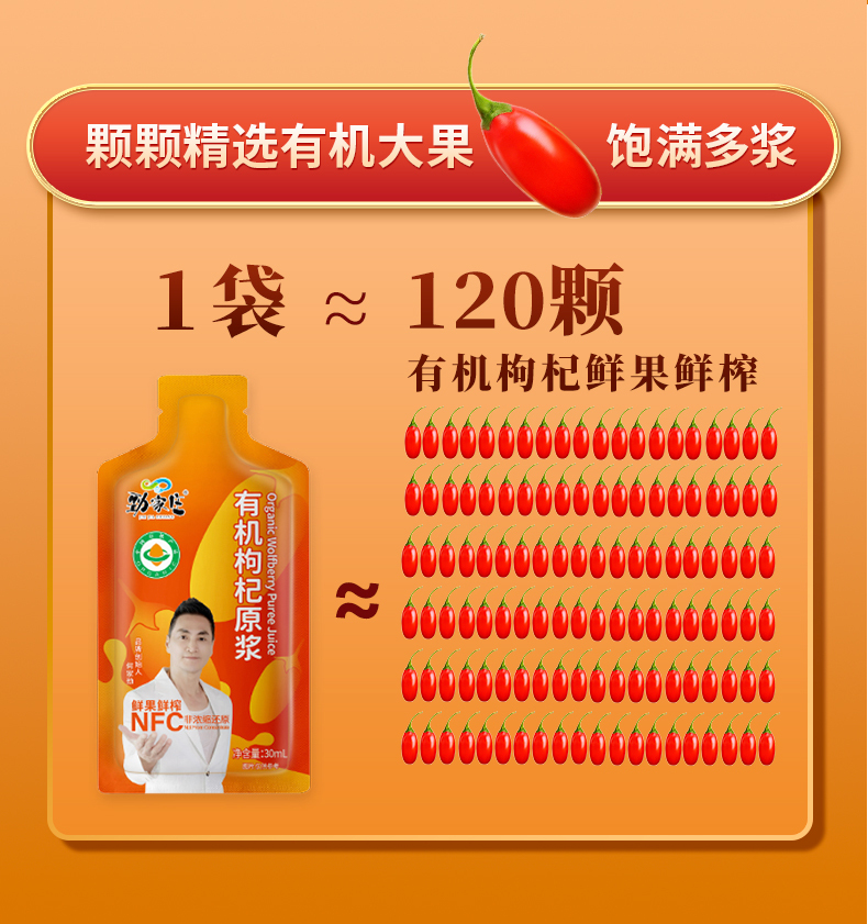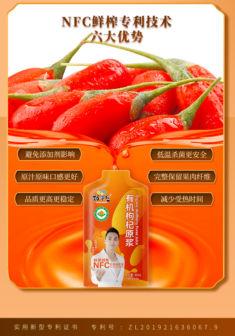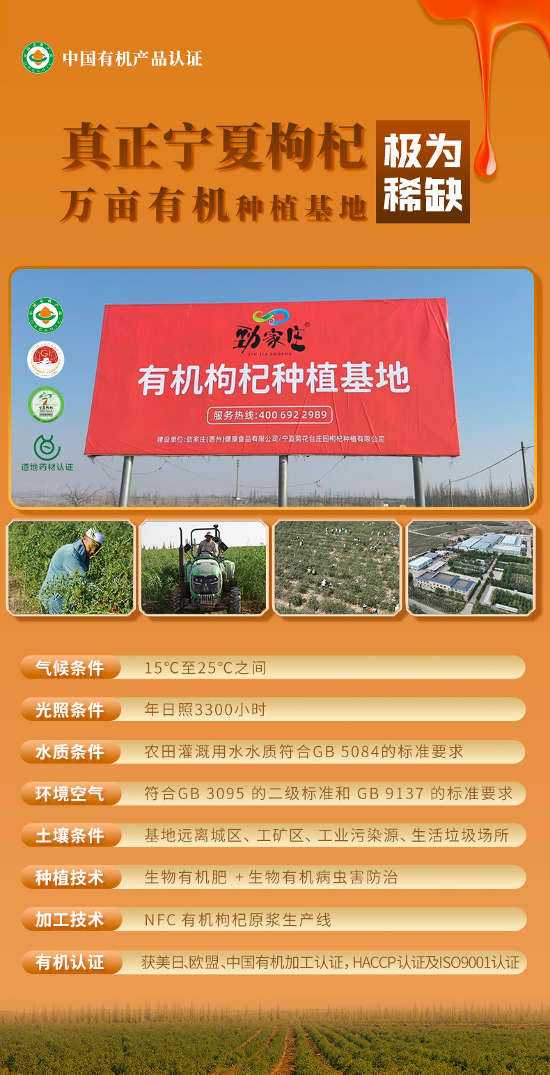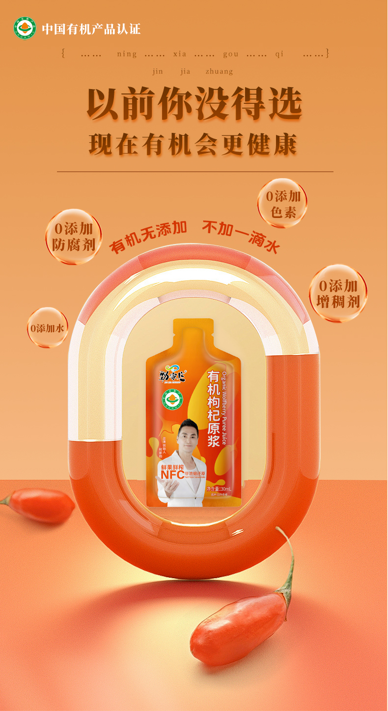 勁家莊的有機枸杞原漿 NFC(非濃縮還原)是一款高品質的健康飲品,採用有機栽培的枸杞製成。保留了枸杞的天然精華,未經稀釋或濃縮,確保營養成分完整。