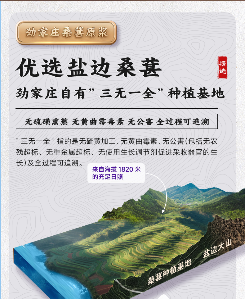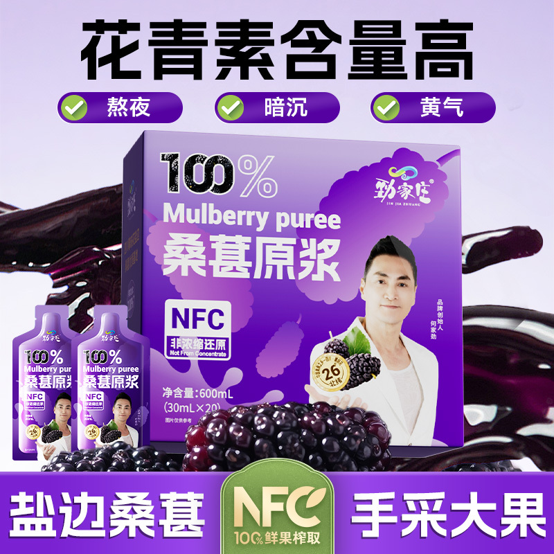 勁家莊的有機桑葚原漿 NFC(非濃縮還原)是一款以天然有機桑葚製成的健康飲品。採用紙盒包裝,保質期為 12 個月。產品不經濃縮還原處理,完整保留桑葚的天然風味與營養成分,適合日常飲用與養生保健。