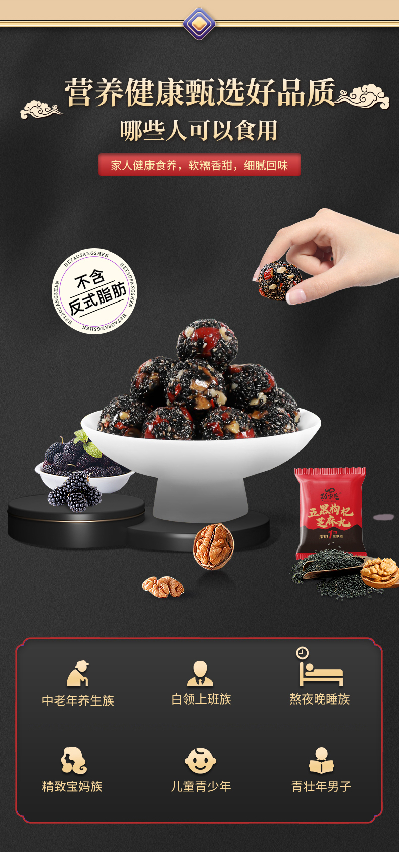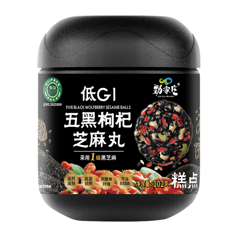 勁家莊精心研製的「低GI 五黑枸杞芝麻丸」,將三大養生食材——合桃、桑椹、黑芝麻——濃縮成一粒粒香濃可口的小丸子,方便攜帶,每日一粒,健康加分。
