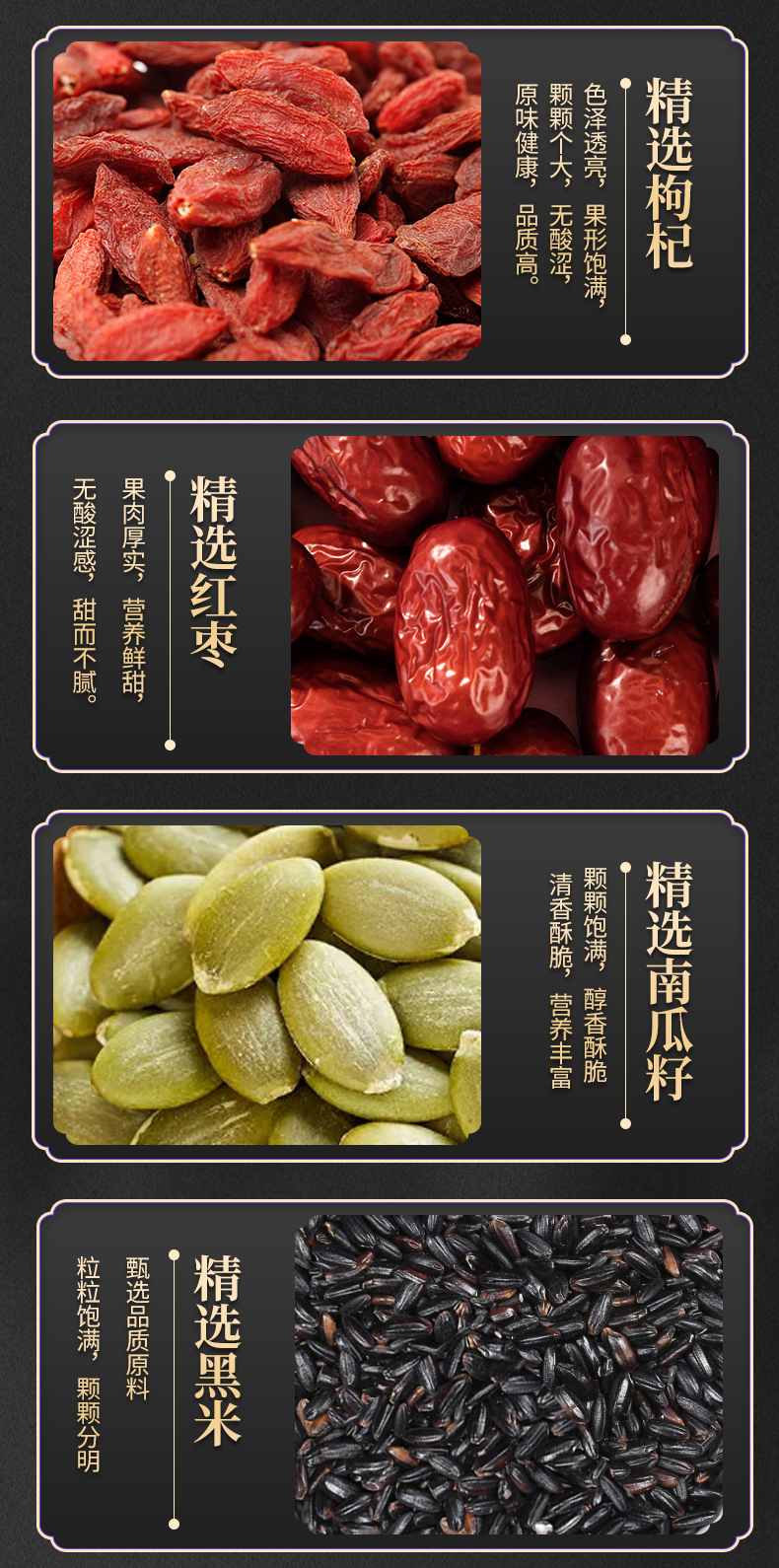 結合五種黑色超級食材——黑芝麻、黑豆、黑米、黑棗、黑木耳,再加入抗氧化力強的枸杞,勁家莊精心製作出這款低升糖指數的健康小丸子,既美味又養生,適合每日補充元氣。