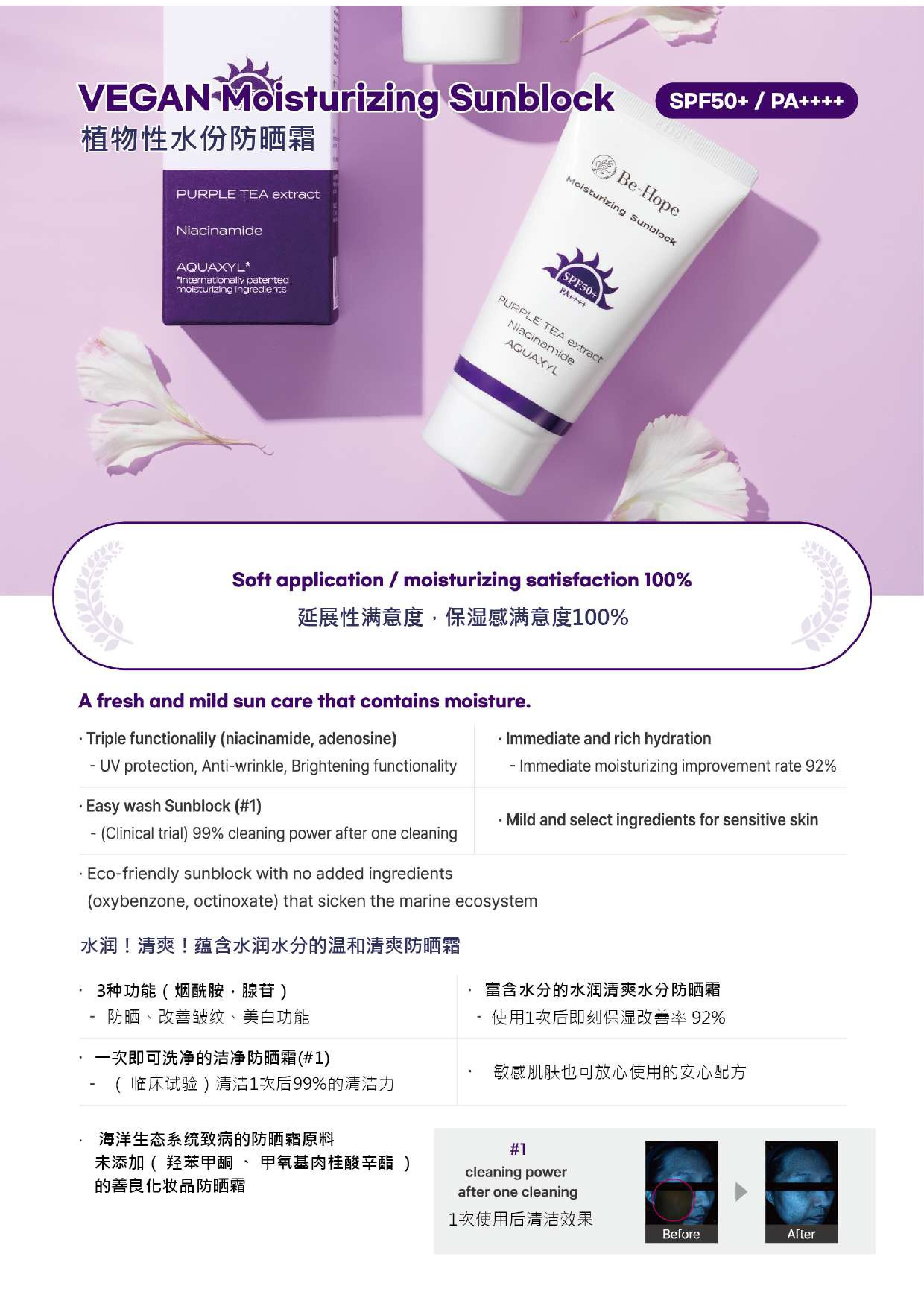 廣東話總結翻譯 Be-Hope 植物性保濕防曬霜質地輕盈又保濕,適合炎熱潮濕天氣下嘅油性肌膚,提供強效防曬之餘唔會堵塞毛孔。配方溫和,含有美白同抗老成分,同時對海洋生態友善,使用得安心又環保。